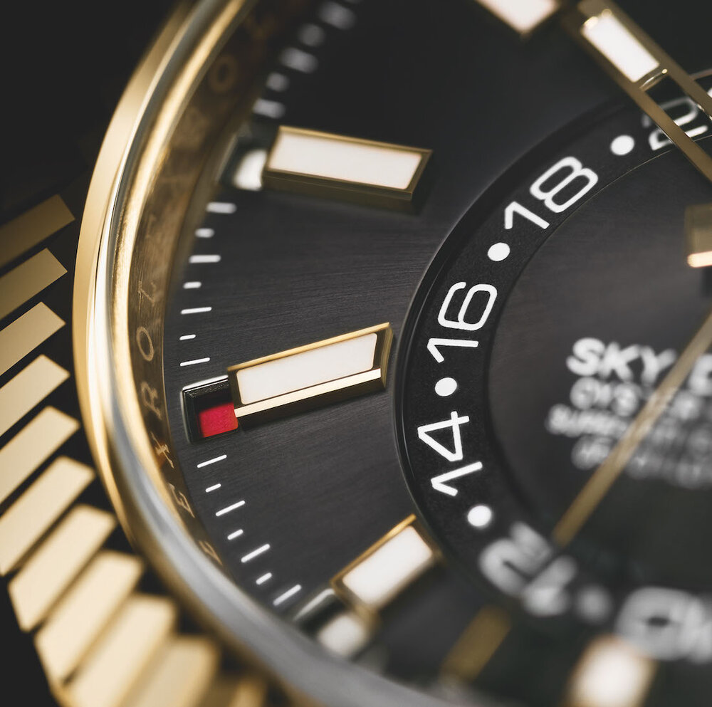 Les indicateurs correspondants ont tous été appliqués et comportent les lumens chromalight de Rolex, tandis que juste à l’extérieur du marqueur se trouve l’indicateur du calendrier annuel, que Rolex appelle Saros: un marqueur rouge se déplace autour du périmètre et affiche les mois de l’année. Le combiné bâton de commande correspondant est partiellement creux pour une lecture idéale du deuxième fuseau horaire. La texture du cadran est ensoleillée et ajoute une touche de brillance à l’ensemble du nom de Rolex Sky dweller Pas Cher Suisse, tandis que la bague 24 heures dispose d’une surface mate qui crée un peu de contraste.